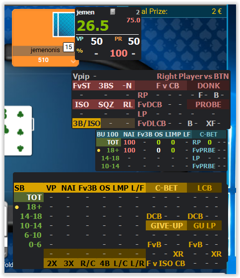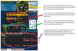 Pour ma part, dès les 1€, j’en ai utilisé un, mais très simple, avec les stats suivantes: VPIP / PFR / 3bet + limpFold + steal bouton et quelques statistiques standards. Ce qui me manquait cruellement, et ce qui le rendait quasi inutile, était le calcul des stats en fonction de la profondeur des vilains.