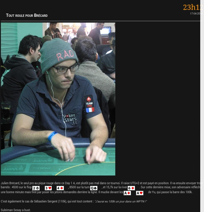 Je vais perdre un gros pot vs un mauvais call vs yu brecard… En MP, Yu Brecard va open et je découvre :9d :9s, et voici comment ça se passe…